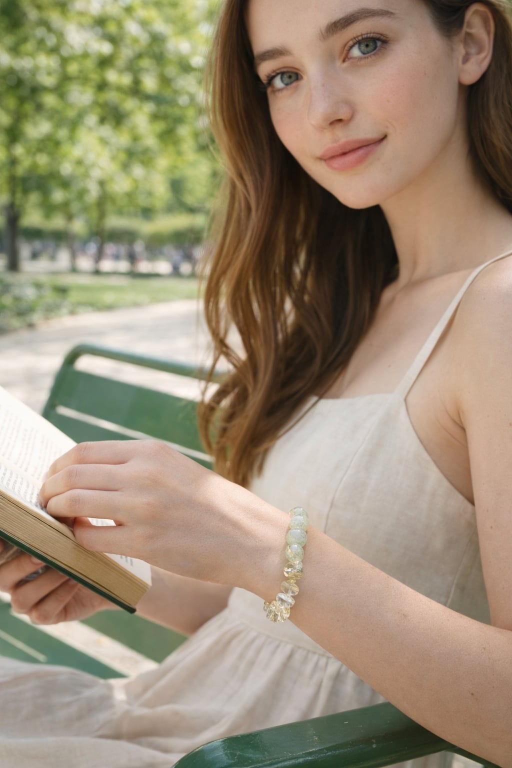 歩くたびレインボームーンストーンが虹色に煌めき、グリーンの瑞々しさが心を満たします。